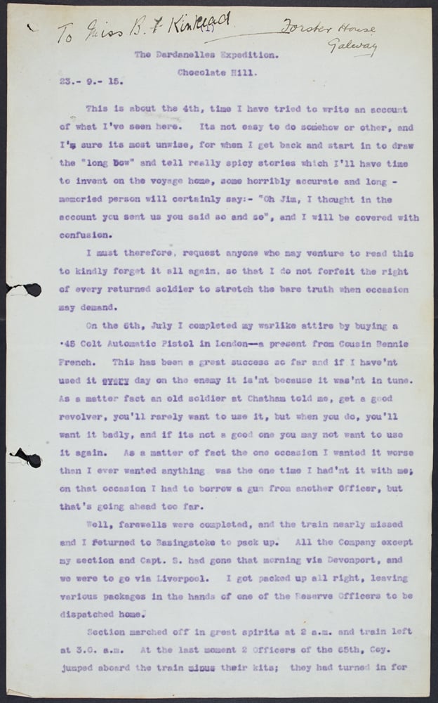 Below are extracts found in the Stephen Gwynn Papers in the manuscript collection in the National Library of Ireland. While they are not his accounts, they document a soldier’s experience as a part of the August Offensive, more specifically at Chocolate Hill from August to October 1915. They may have been in Stephen Gwynn’s possession as part of his research for the Dardanelles Commission.